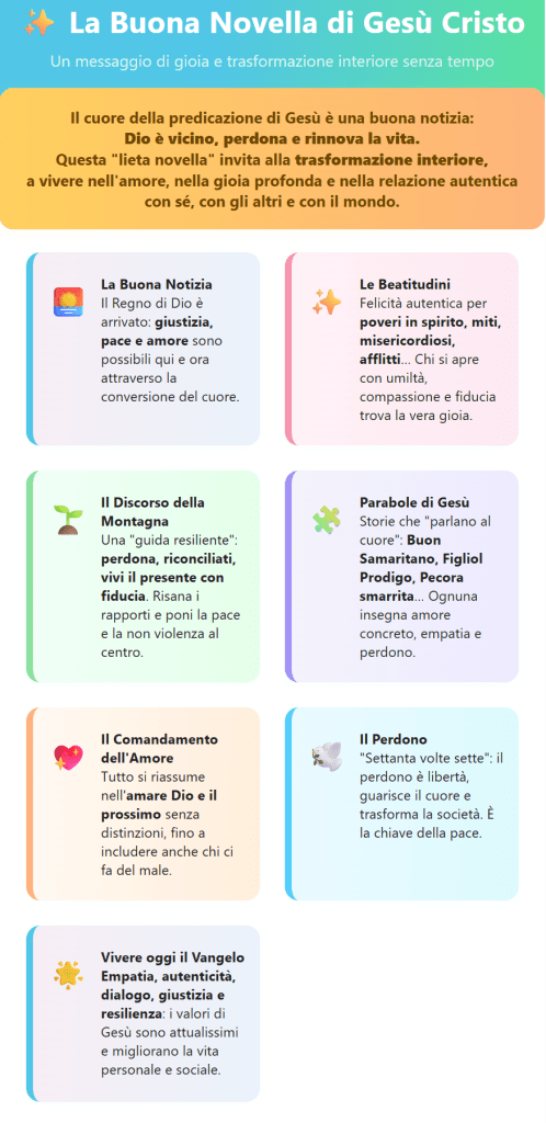 In conclusione, l’invito per il lettore “spiritualmente curioso” è di accostarsi direttamente a queste fonti evangeliche, magari rileggendo i discorsi e le parabole citate, lasciando che parlino al proprio cuore senza filtri dottrinali imposti. Immaginate di sedervi sul monte tra la folla e ascoltare quel giovane maestro galileo dire “Beati…”, oppure di assistere alla scena del Samaritano che fascia le ferite dello sconosciuto: cosa suscita in voi? Che eco trovano queste parole nella vostra esperienza? Il Vangelo, letto così, non è un testo morto, ma un dialogo vivo che ci interpella personalmente. E, se permettiamo a quel dialogo di continuare nella nostra vita quotidiana, scopriremo forse la verità di quell’affermazione audace: “Il regno di Dio è dentro di voi”. In altre parole, il messaggio originario di Gesù non è lontano né astratto: è già seminato nel profondo della nostra coscienza come chiamata all’amore, alla gioia e alla pienezza di senso. Accoglierlo e metterlo in pratica – pur con tutti i nostri limiti e cadute – può davvero aprire la porta a una vita nuova, in cui la buona notizia della gioia diventa esperienza reale. Come proclama una delle Beatitudini, «Rallegratevi ed esultate, perché grande è la vostra ricompensa nei cieli» – e già pregustabile nei frutti di pace e felicità sincera che raccogliamo su questa terra quando viviamo nell’amore. Questo, in definitiva, è l’originario messaggio di Gesù Cristo secondo i Vangeli: una gioia rivoluzionaria che trasfigura il cuore e il mondo, da sperimentare ogni giorno “facendo anche noi lo stesso”, sulle sue orme.