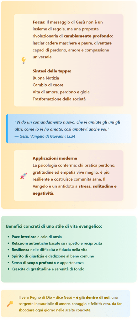 È importante sottolineare che ciò che Gesù propone non è una semplice morale o un insieme di regole esteriori, ma un percorso di trasformazione spirituale ed esistenziale. Per questo spesso parla per paradossi (chi si umilia sarà esaltato, i primi saranno ultimi, per vivere davvero bisogna “perdere” la vita in senso egoistico) e tramite immagini evocative: vuole colpire l’immaginazione e spingerci a un cambio di prospettiva. Si tratta, in fondo, di passare dall’egocentrismo all’amore come centro: questo è il “Regno di Dio dentro di noi” di cui parla. È un cambiamento che avviene giorno per giorno, nelle piccole scelte: quando decidiamo di perdonare un’offesa invece di ricambiare, quando restiamo onesti anche se conviene barare, quando dedichiamo tempo ad aiutare qualcuno senza aspettarci nulla indietro, quando troviamo dieci minuti per meditare in silenzio e magari affidare le nostre preoccupazioni a Dio invece di farci travolgere dalla frenesia – in tutti questi atti concreti il Vangelo prende vita oggi. E la “buona notizia” è che questo stile di vita evangelico funziona: rende più sereni noi e più luminoso l’ambiente intorno a noi. Non elimina magicamente i problemi, ma cambia noi nell’affrontarli.